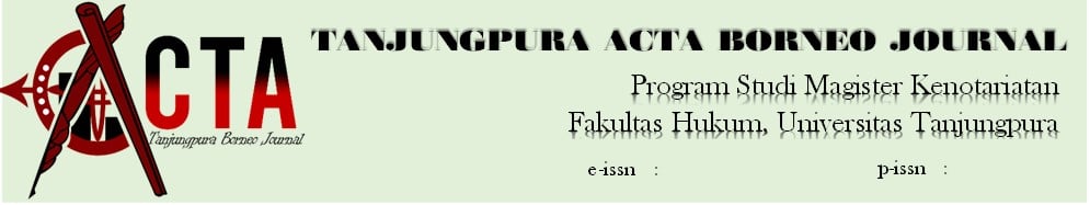 Tanjungpura Acta Borneo Journal - TABJ adalah jurnal yang diterbitkan oleh Program Studi Kenotariatan Program Magister, Fakultas Hukum Universitas Tanjungpura. Terbitan TABJ dimulai pada tahun 2022 dengan frekuensi penerbitan dua kali dalam satu tahun (April, Oktober). Jurnal ini adalah media komunikasi dan pengembangan ilmu. Redaksi menerima naskah artikel laporan hasil penelitian dari mahasiswa, akademisi maupun praktisi, sepanjang relevan dengan misi redaksi.